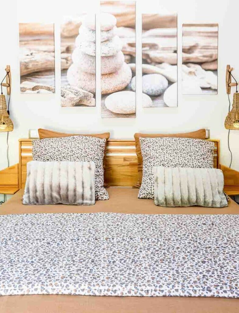 Chaque nuit vous dormez dans un lit queen size (160×200 cm) habillé de linge en gaze de coton tout doux. Grâce à la décoration soignée et à l’ambiance apaisante, vous vous sentez immédiatement plus posés.