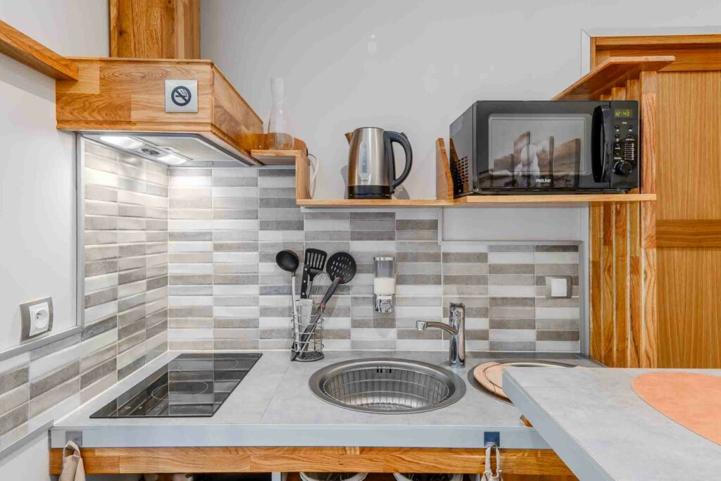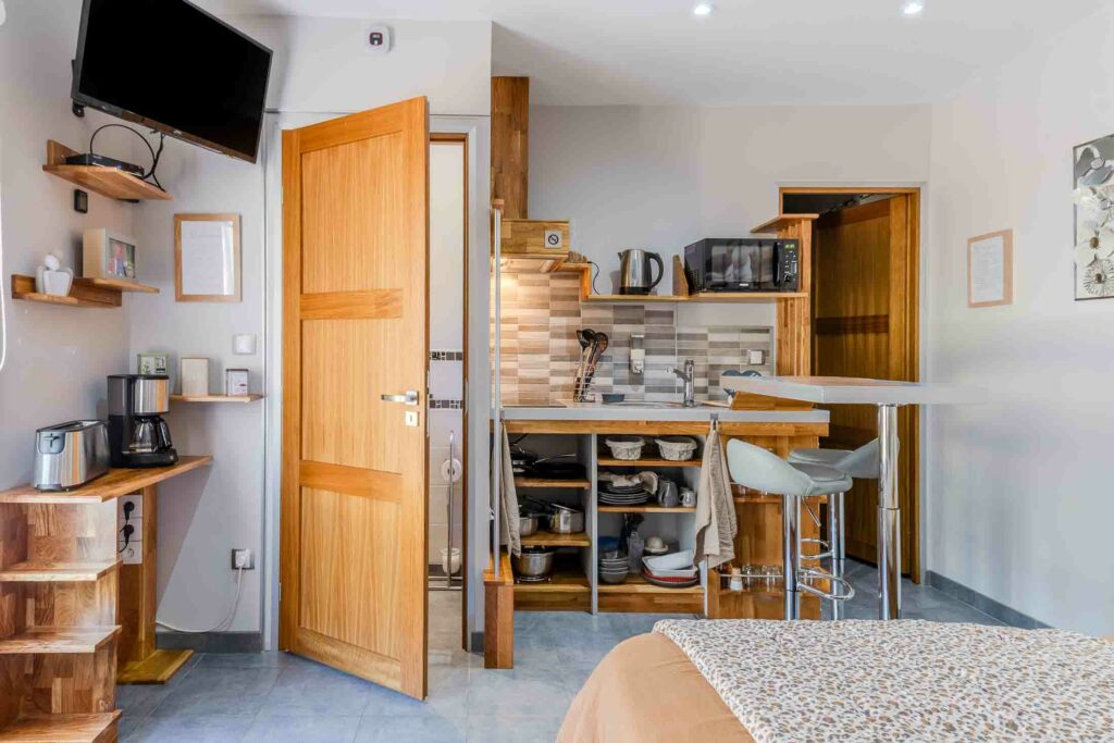 Chaque photo montre simplement ce que vous retrouverez sur place : un cadre doux, discret, où l’on prend le temps sans contrainte. Lit queen-size, douche spacieuse, jacuzzi privatif, sauna selon le studio, terrasse, parc arboré, petits-déjeuners maison et espaces extérieurs : tout est pensé pour que le séjour reste simple et agréable.