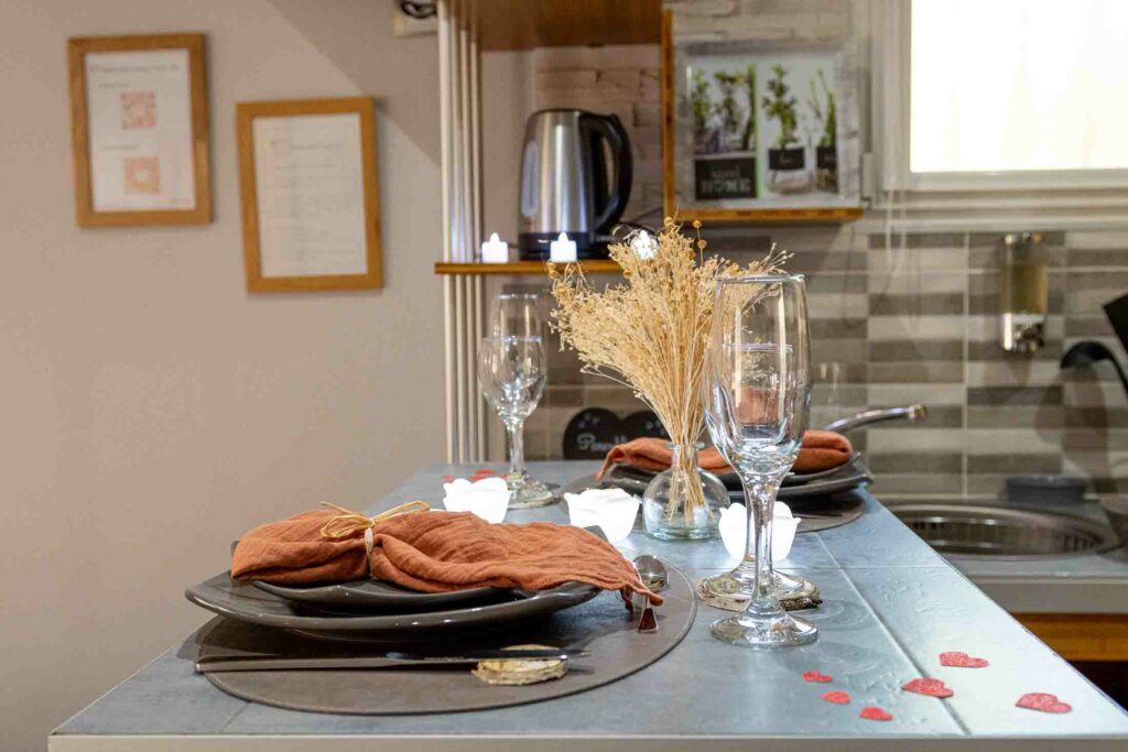 Sa kitchenette équipée vous permet de préparer un petit repas à deux, en toute intimité : plaques de cuisson, petit frigo, micro-ondes, vaisselle, cafetière… tout y est.